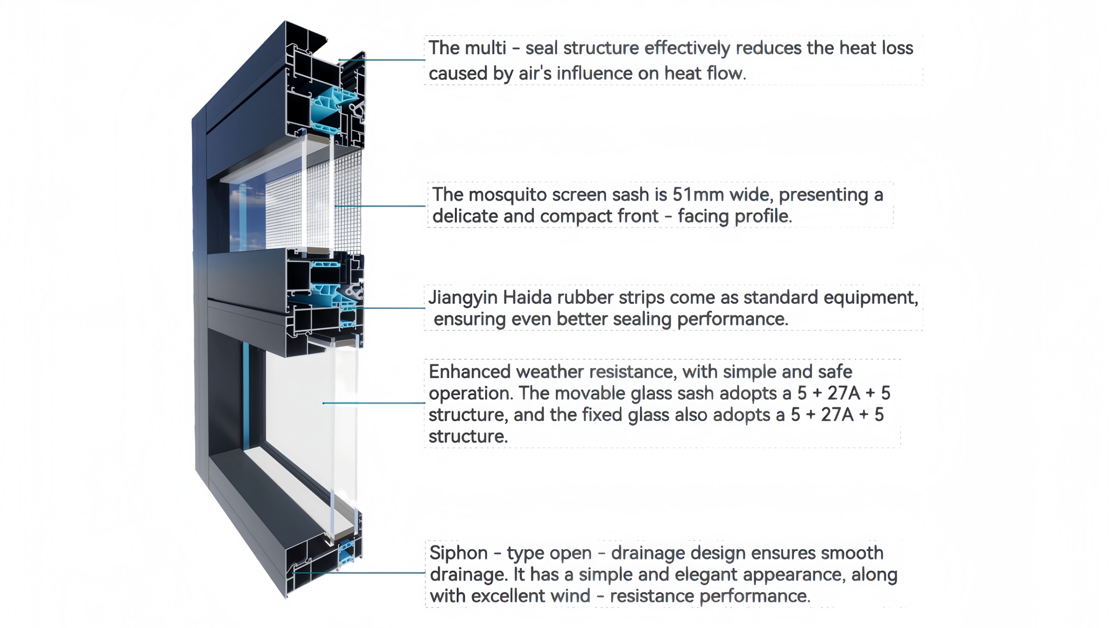 4. The thermal break uses PA66 nylon thermal insulation strips, providing excellent thermal insulation performance.