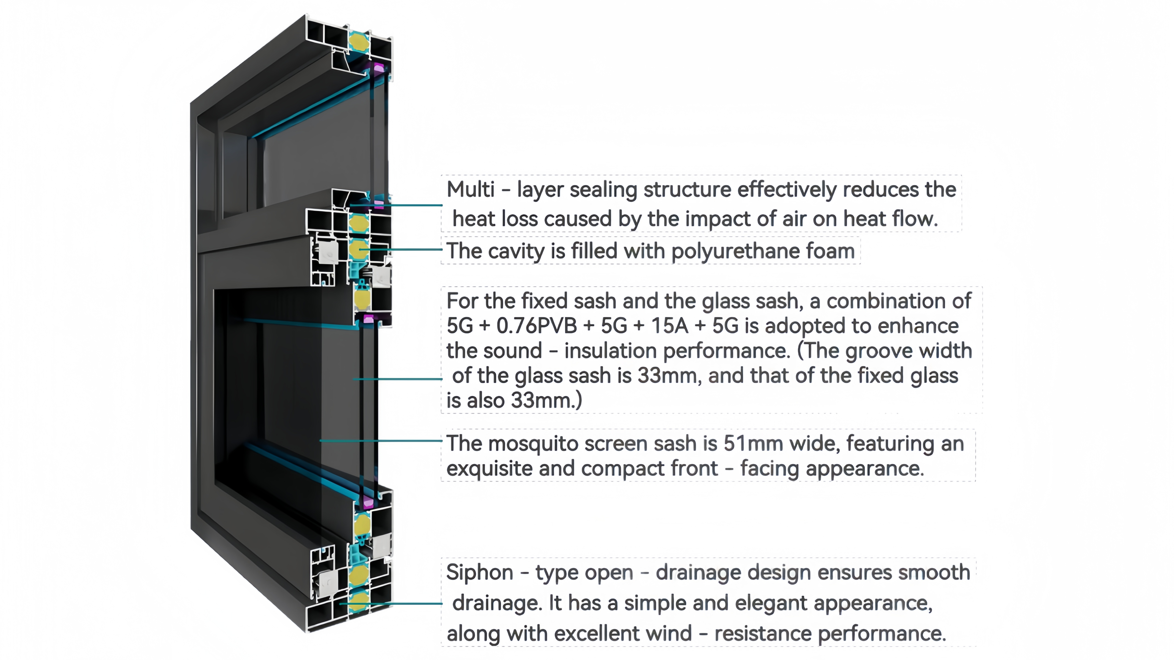 4. The thermal break uses PA66 nylon thermal insulation strips, featuring strong thermal insulation performance.