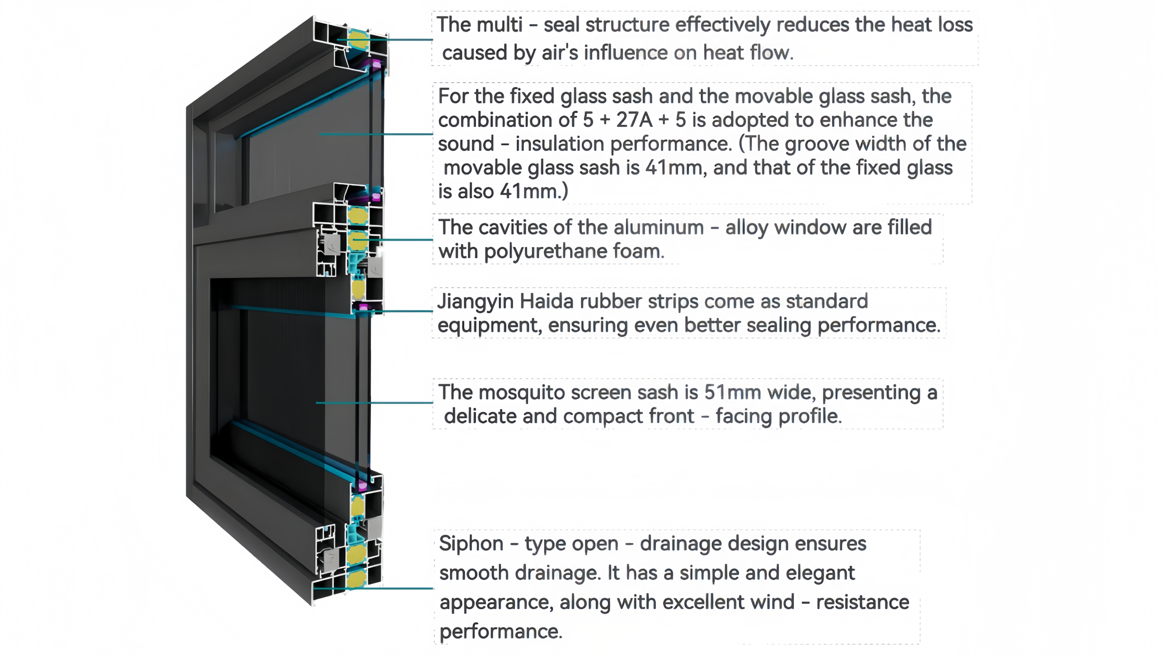 4. The thermal - break section uses PA66 nylon thermal insulation strips, featuring excellent thermal insulation performance.