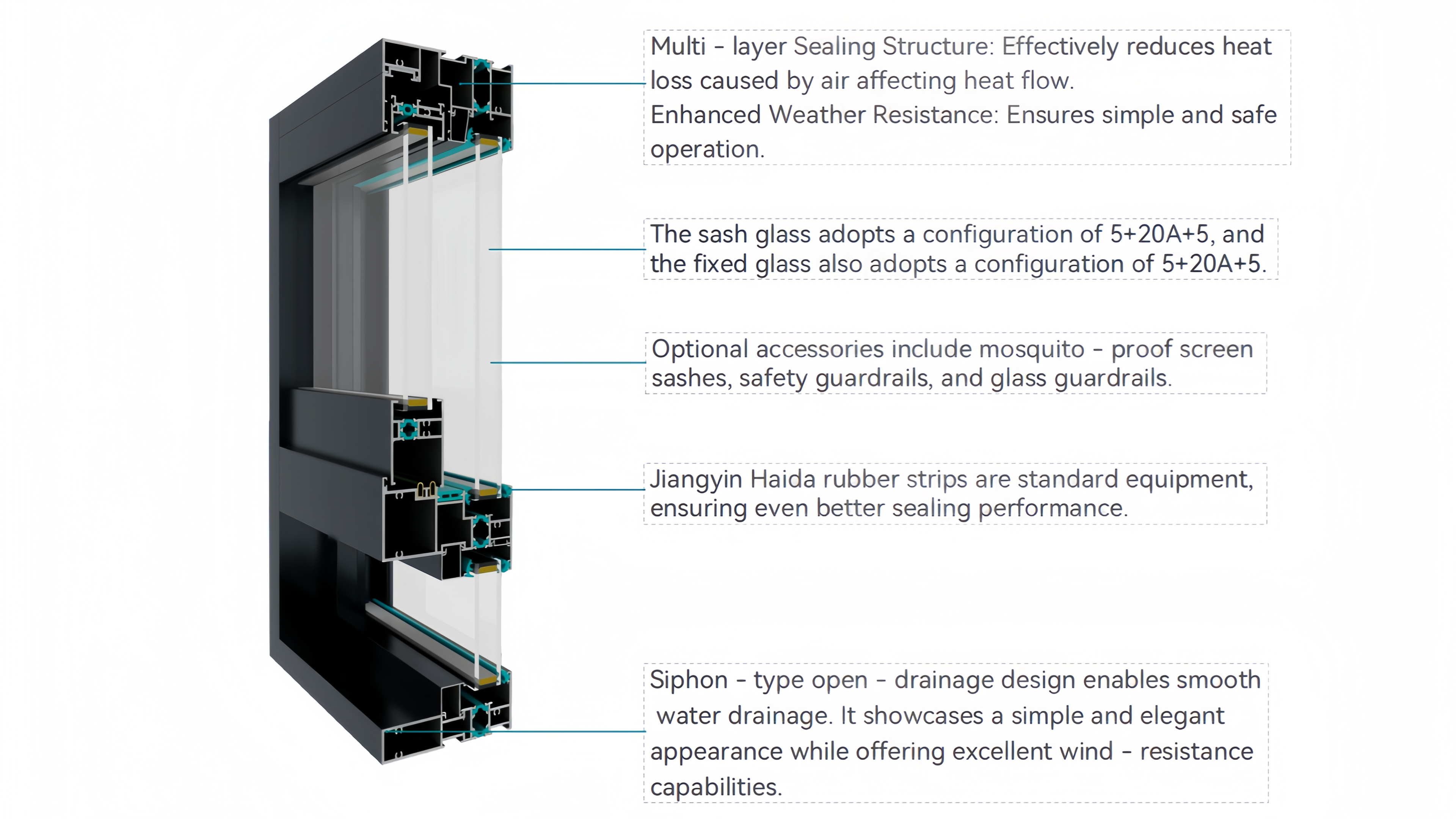 4. The thermal break uses PA66 nylon thermal insulation strips, which provides strong thermal insulation performance.