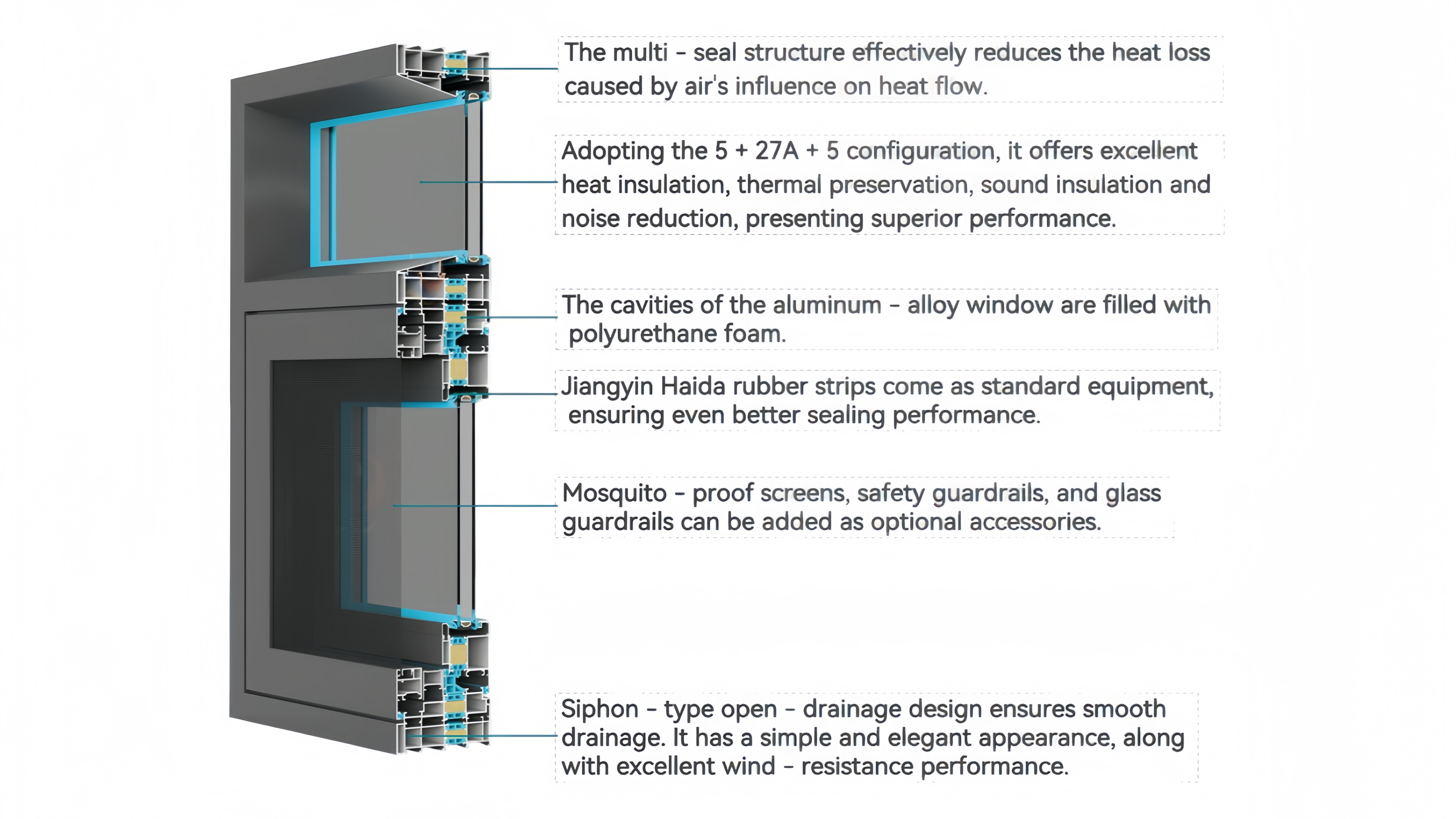 4. The thermal break section uses PA66 nylon thermal insulation strips, which endows it with strong thermal insulation performance.