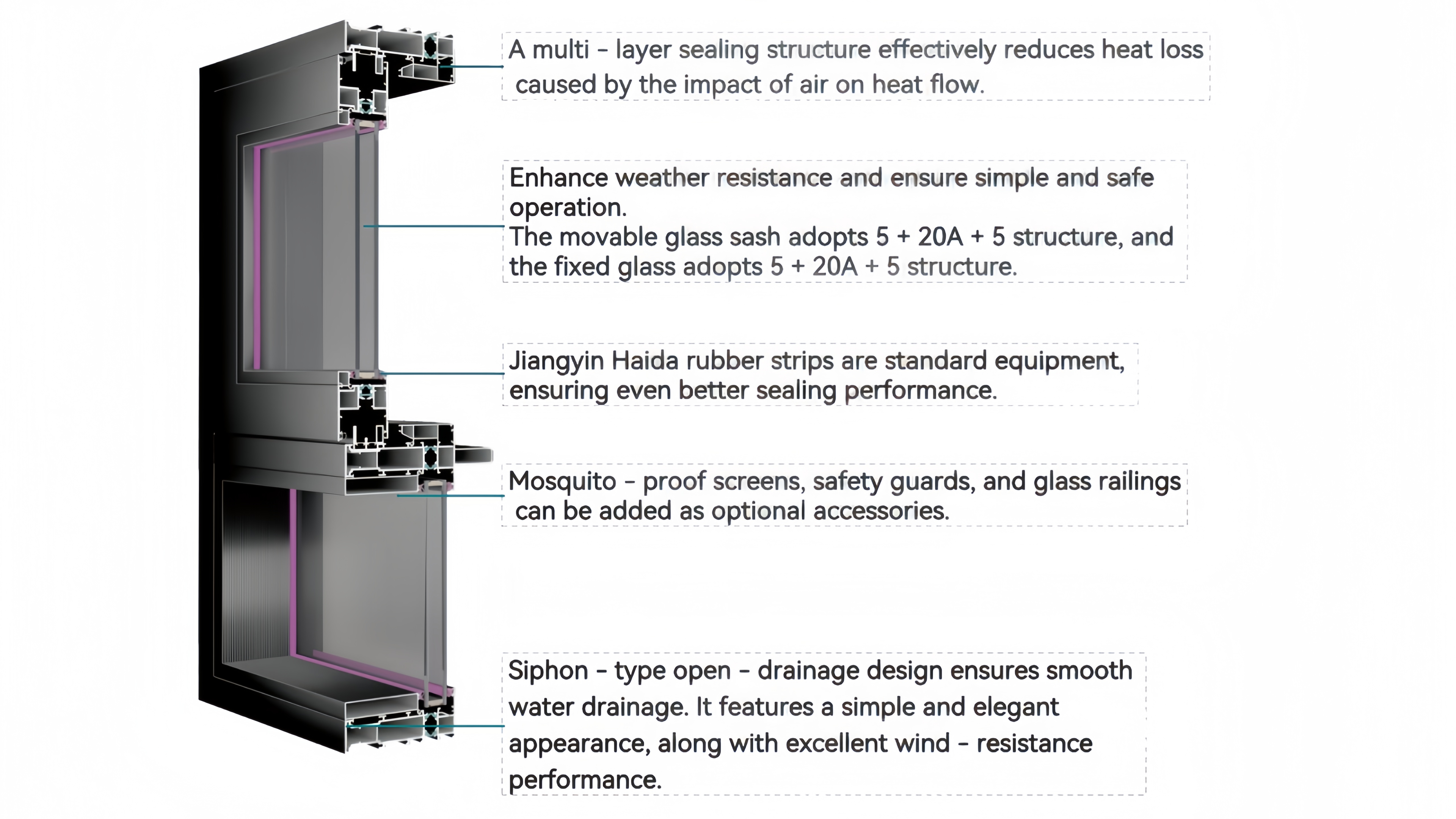 4. The thermal break uses PA66 nylon thermal insulation strips, offering excellent thermal insulation performance.